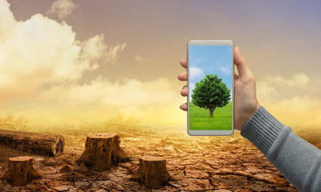 Woman hand holds modern green tree screen smartphone on dead stump tree and cracked land. Saving environment and natural conservation concept.