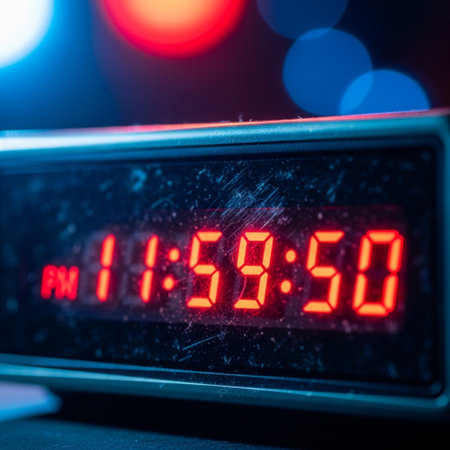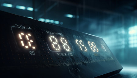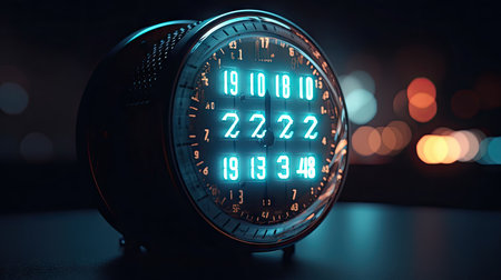 The red digits of a retro-futuristic clock burn brightly in the darkness, displaying a specific moment in time. This image evokes a sense of high-tech suspense and nostalgia, perfect for concepts related to deadlines, cyberpunk aesthetics, or digital countdowns.