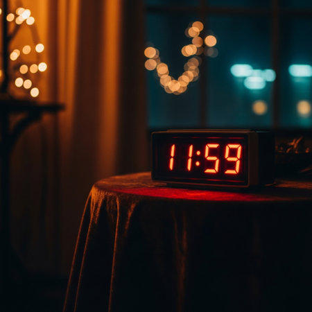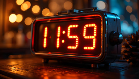 A digital clock displays 11:58 against a bokeh background of sparkling lights, suggesting a New Year's Eve atmosphere. Ai generated