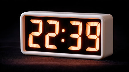 This image features a modern digital clock showcasing the time of 22:39 in bright orange numbers against a black background, ideal for decor or technology themes.