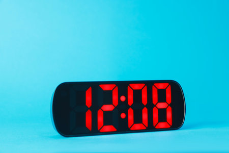 Digital alarm clock showing 12:08 o'clock on light blue background, closeup