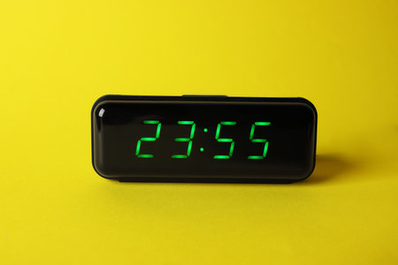 Digital alarm clock showing 23:55 o'clock on yellow background