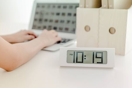 Woman using her laptop with clock