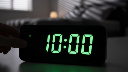 A digital alarm clock displays 10 -00 in a dark room