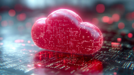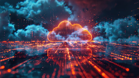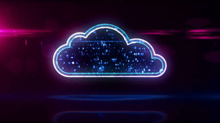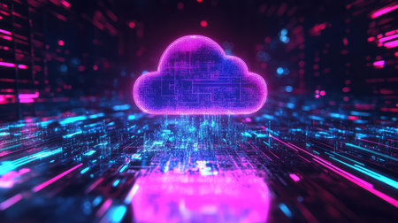 A modern cloud computing concept featuring neon lights and digital elements, symbolizing data storage and connectivity in a high-tech digital landscape.