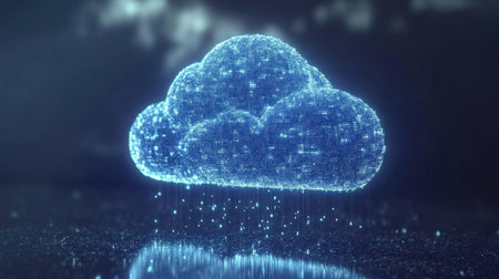 A digital cloud emitting glowing rain in an abstract blue atmosphere at night