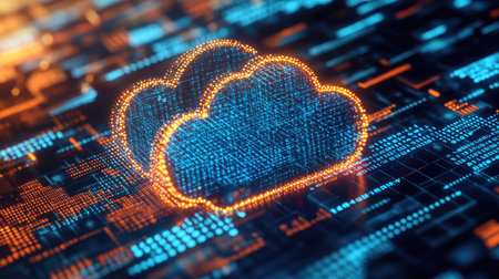 This vibrant digital cloud technology concept features glowing data patterns in neon orange and blue against a futuristic circuit background, representing information flow.