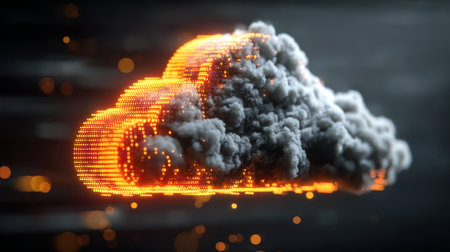 This captivating image showcases an abstract digital cloud in vibrant colors, surrounded by glowing particles, symbolizing advanced technology and innovation.