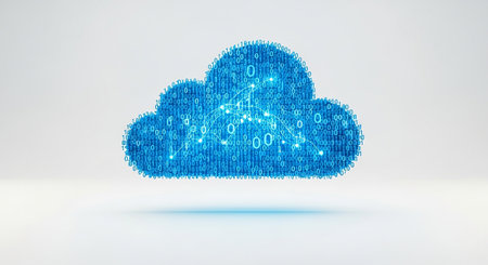 Abstract digital cloud with binary code and data flow, representing cloud computing and storage.