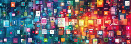 A collection of smartphones showcases engaging stories and short videos against a lively, colorful backdrop, highlighting social media usage.