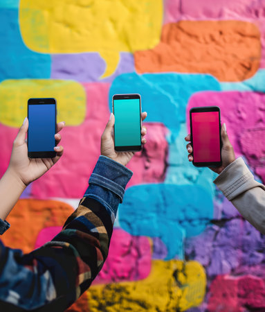 Three individuals standing in front of a vibrant wall, each holding up a smartphone with speech bubbles.