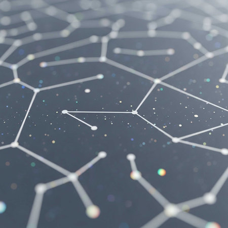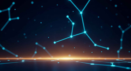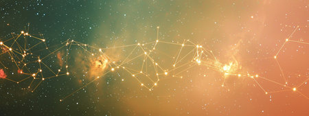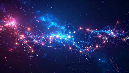 Connected network of nodes radiating across a galaxy backdrop