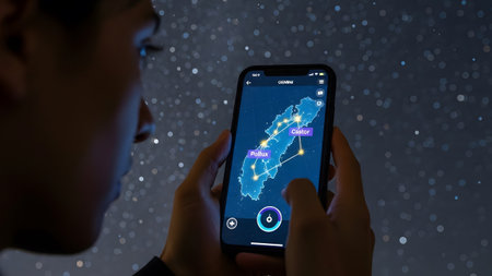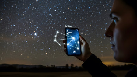 Person uses phone to identify Orion constellation in starry night sky. Clear details and vibrant ...