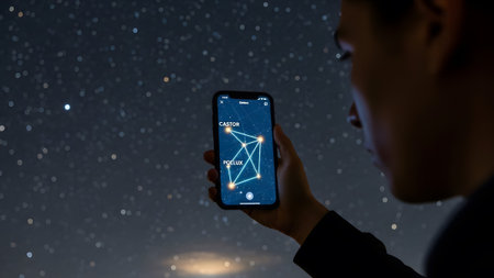Person views constellation of Castor and Pollux on a smartphone screen at night. Clear details an...