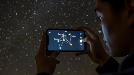 Person uses smartphone app to identify Gemini constellation in starry night sky Clear details and...