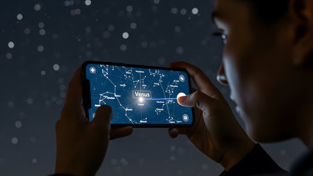 Person uses a smartphone app to view constellations and planets in the night sky. Clear details a...