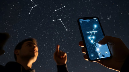 Person points at sky while using smartphone app to identify the Big Dipper constellation.