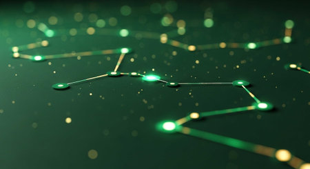 A futuristic green and gold network of connected dots and lines on a dark background