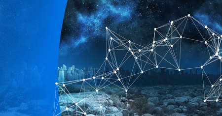 Internet connection grid, against the background of the starry sky. Abstract geometric background with connected dots. Copy space. Technologies.