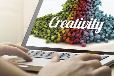 inspiration concept: man using a laptop with creativity on the screen. Screen graphics are made up.