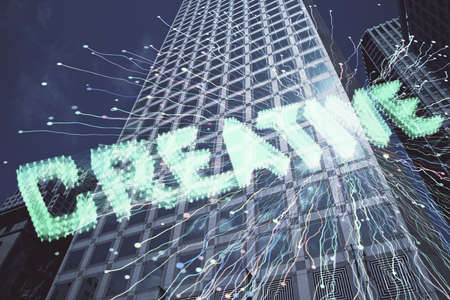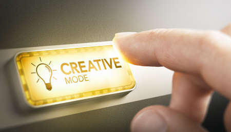 Finger pressing a rectangular button with the text creative mode. Creativity concept. Composite image between a hand photography and a 3D background.