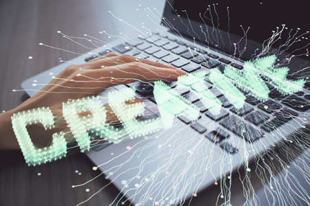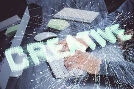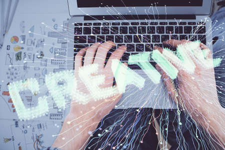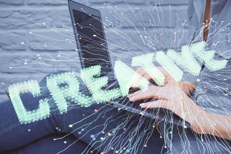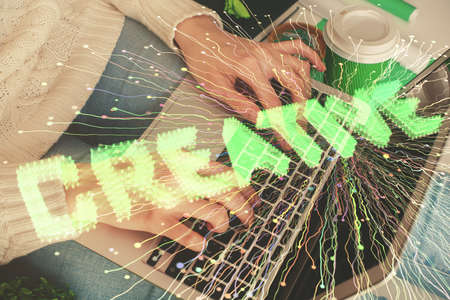 Double exposure of woman hands typing on computer and creative drawing. Start up concept.