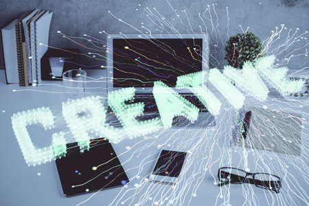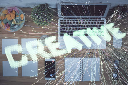 Start up theme drawing over computer on the desktop background. Top view. Double exposure. Brainstorm concept.