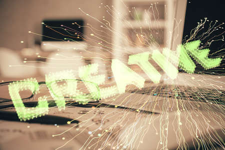Desktop computer background in office and start up theme hologram drawing. Double exposure. Startup concept.