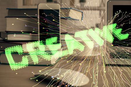 Multi exposure of creative drawing over table with phone. Top view. Concept of startup.