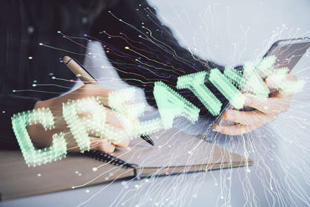 Start up creative drawing over close up hands on background. Concept of brainstorming. Multi exposure