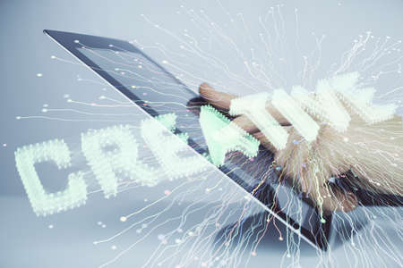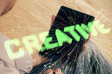 Double exposure of man's hands holding and using a mobile device and creative hologram drawing.