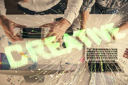 Double exposure of man and woman working together and creative hologram drawing. Computer background. Top View. Start up concept.