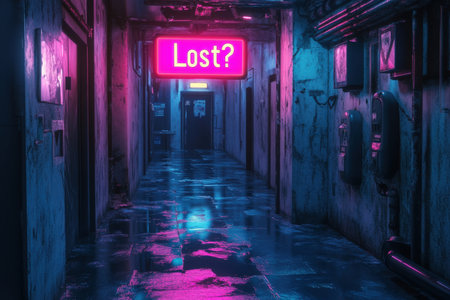 Dimly lit corridor featuring vibrant neon lights and a retro lost? sign exudes a mix of cyberpunk and urban exploration atmosphere. wet floor adds mysterious allure.