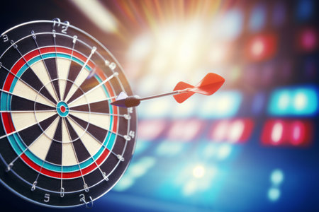 Concepts of business strategy and goals. Red darts embroidered on the Dartboard on black background with orange light. Dart in the bullseye.