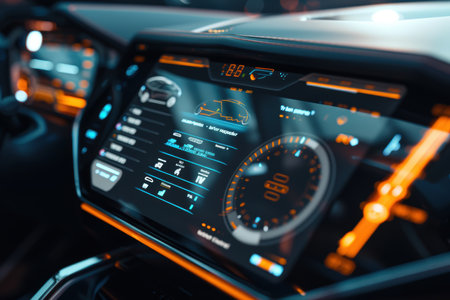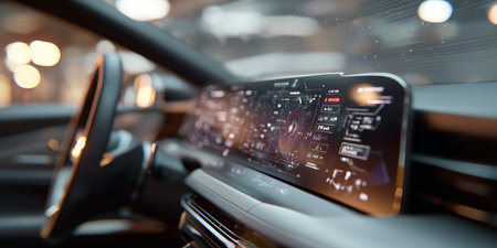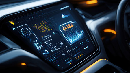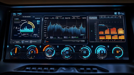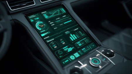 This image showcases an advanced digital dashboard interface designed for modern vehicles, featuring dynamic data display and user-friendly controls.