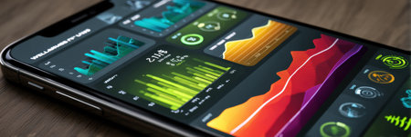 A sleek smartphone shows vibrant data charts and graphs against a dark background. The device captures attention with its user-friendly interface and illuminated ambiance.