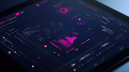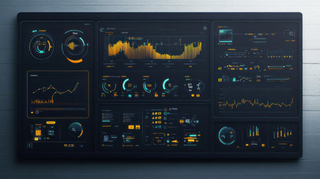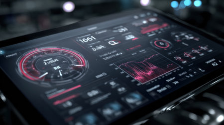 Explore a high-tech user interface featuring a digital dashboard with various metrics and analytics. Perfect for technology themes and futuristic concepts.