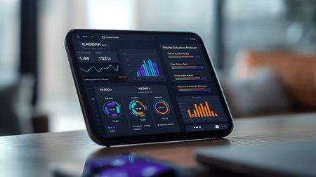 A sleek laptop shows a modern digital dashboard with colorful data visualizations and analytics, set in a contemporary workspace, perfect for business insights.