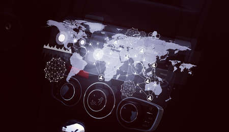 Dashboard of a modern sports car with a navigation display. Cockpit of an autonomous car with an abstract graphic touch interface. Diagnostic auto, modern design, auto repair, car service.