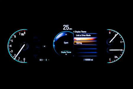Modern light car mileage (dashboard, milage) isolated on a black background. New display of a modern car. RPM, Fuel indicator and temperature. Display theme. 25 mph.