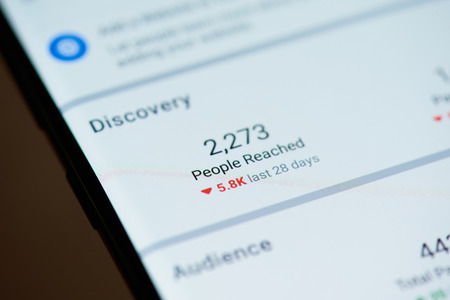 New york, USA - october 4, 2018: People reached in facebook post on smartphone screen close up view