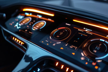 Modern Car Dashboard With Orange Lights and Buttons, Display a sleek, modern dashboard with intuitive controls for lighting, temperature, and security