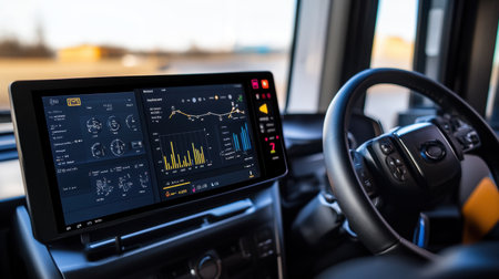 Close-up view of a sleek vehicle dashboard featuring advanced technology, displaying performance metrics and navigation tools for a modern truck driving experience.