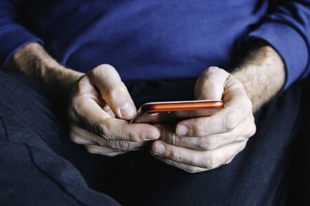Male hands holding a mobile phone in a waiting room Technology concept. Man hands with smartphone