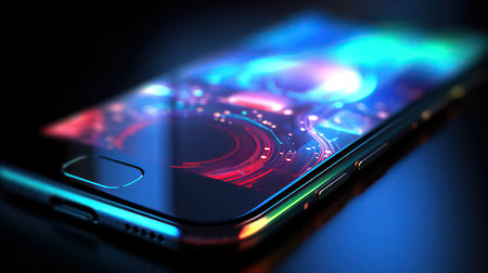 Close up of a smartphone with colorful neon light. AI generated 3d image