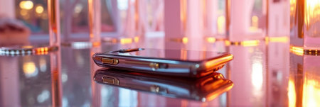 Sleek smartphone reflected on glass surface with warm ambient lighting. That the image is generated using AI.