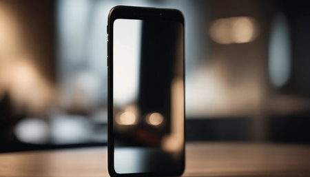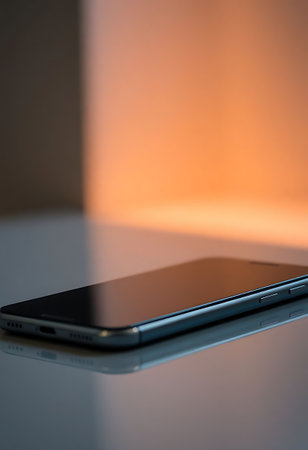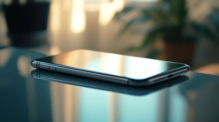 Smooth shiny surface of a new smartphone on a sleek modern desk, reflecting soft light