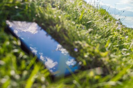 Abstract photo of smartphone with reflection of sky in the screen. Sky with clouds on blurred background