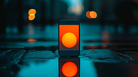 Modern smartphone featuring a blank orange screen, reflecting beautifully on a dark glass surface, creating a striking visual in low light