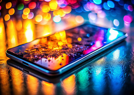 A stunning close-up image of a smartphone screen reflecting vibrant bokeh lights. The colorful illumination creates a mesmerizing abstract background, evoking a sense of modern technology and creativity.